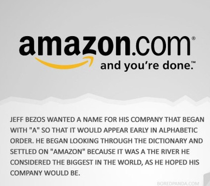 Amazon(亚马逊):Jeff Bezos想要一个以字母A开头的公司名,这样在字母表顺序中,它就会出现在很前面。他开始翻起字典,最终决定为“AMAZON”,因为这是他认为世界流量最大的河,当然他希望自己的公司亦是如此。