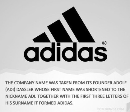 adidas(阿迪达斯):此公司名称以其创办者的名字(Adolf Dassler)来命名,他的名Adolf缩短成昵称则为ADI。再连同他的姓中前三个字母,就得到了ADIDAS。
