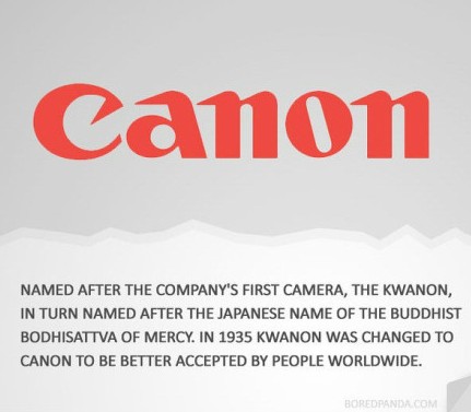 Canon(佳能):以公司第一款相机“KWANON”命名,即观音菩萨的日文名。为了让世界各地人们更好的接受,在1935年,KWANON被改成了CANON。