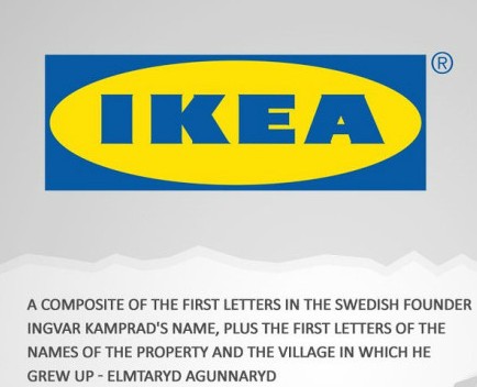 IKEA(宜家):公司名称IKEA其实是他个人名字Ingvar Kamprad、他生长农庄名称Elmtaryd和村落名称Agunnaryd的开头字母组合。