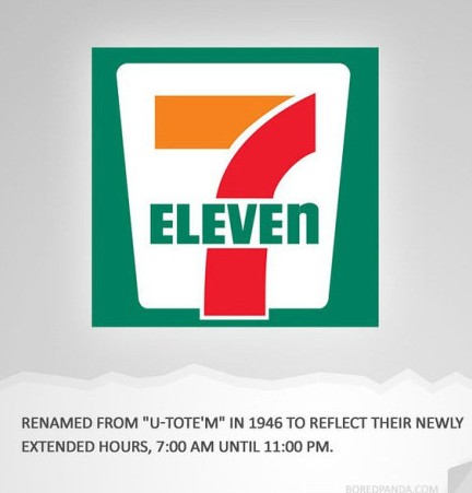 7 ELEVEN:自1964年的“U-TOTE‘M’”后,为体现出其延长开放时间——7:00am到11:00pm——而重新命名。当然,现在已经24小时了。