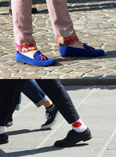什么叫做细节之处到位?光是注重附加配饰是远远不够的,要与自身连结成一体方才显示你的神通。长裤明明很普通,但换成红色格纹就稍显不同,再加之裤脚的印花花边,风骚瞬间非你莫属。大概很少有人会想到在袜子上做文章,而且一做就是大文章,不知道把图案换成五星红旗会怎样——兴许会被请去喝茶吧。