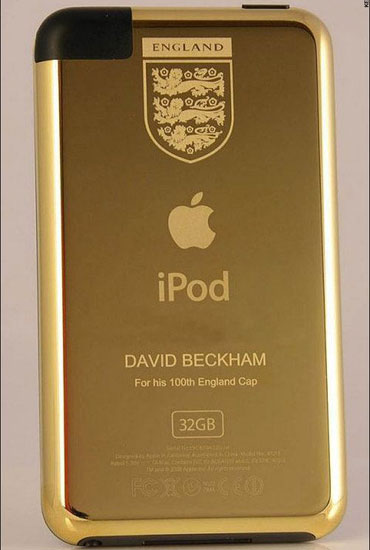 小贝为国家足球队出场比赛达到100场,获赠全金打造特别版ipod,这款iPod Touch的容量为32GB,背部刻上了“大卫·贝克汉姆,代表国家队出场比赛100场”的字样。
