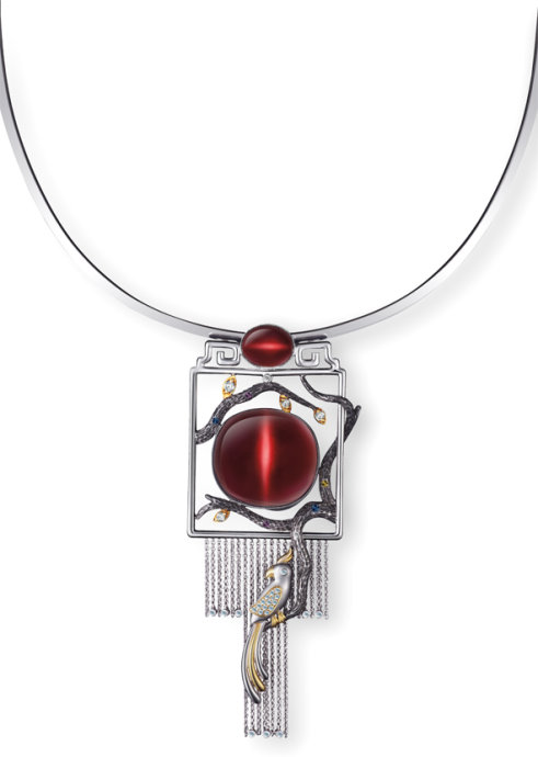 以纯手工工艺打造树枝和树皮的斑驳肌理,花枝、凤凰工艺精湛、线条流畅,与极品抛光工艺完成的碧玺交相辉映,浑然一体。以陶渊明笔下虚幻却又生动逼真的人间仙境为设计灵感,将具有猫眼效应的红碧玺所放射出的水流花放与路转峰回、山鸟似欲啼往事的独特造型融会贯通,重现了令人心神向往的桃花源。搭配晚礼服出席重要的宴会的,让您的尊贵闪耀着神秘东方气质。