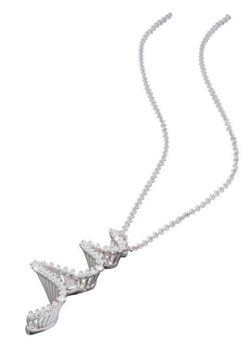 共选取10颗高品质花型切割白钻,配以136颗圆形白钻。独特的花式切工将钻石的璀璨体现到极致,冰晶般洒落一片的点点钻星如同夜空中的繁星,与高贵的佩戴者交相呼应,使其熠熠生辉。光影下变幻闪烁奕奕光彩,令注视的眼神渐变迷离。无疑是宴会首选佳品。
