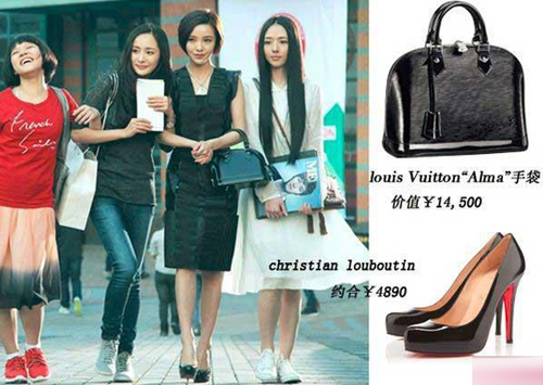 自称从初中开始看时尚杂志的顾里,自然从头到脚都是名牌,全身上下都写满了“贵”字。四姐妹中,郭采洁饰演的顾里一身黑色造型,显得过于成熟和突兀,不过最抢眼的莫过于手上这款由范冰冰代言的,价值1.4万人民币的LV“ alma”手袋。而黑色恨天高底下的那一抹来自鲜红色鞋底则来自法国顶级鞋履Christian Louboutin。