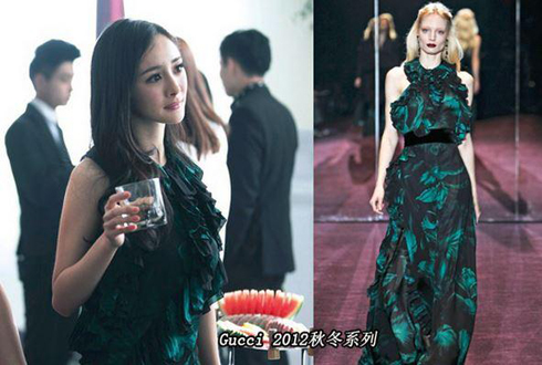 同被大量奢侈品武装的郭采洁相比,杨幂饰演的林萧就显得朴素许多,不过这场参加酒会的戏码中,刚毕业还是个小助理的林萧就已经穿着gucci的礼服了,绿色的印花倒是很衬杨幂的肤色。不过去掉了原本的宽腰带,层层叠叠的荷叶边则显得有些累赘不精神,比例也破坏掉,显得没有腰身。