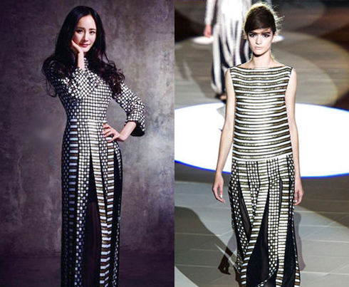 杨幂海报上的这件礼服为Marc Jacobs2013秀场改良款,经典的格纹条纹混搭,让身穿这件礼裙的杨幂看起爱姿态十分娇媚可人