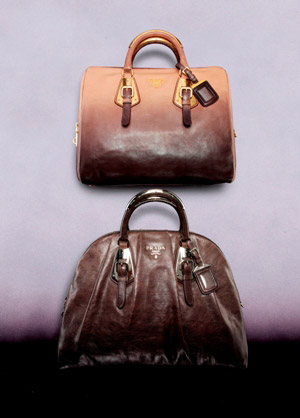 PRADA今年秋冬推出的渐层包,一改前季皱折或流苏的繁复作风,以简单经典的包型,突显渐层色泽变化的细腻质感。带有特殊渐层华丽质感的羔羊皮或小牛板为材质,手工鞣制的温润触感,皮革部份是经过特殊渐层仿古染色后精制,再以金银双色的金属拉炼细节装饰,此外,大容量的空间,使用起来相当方便。