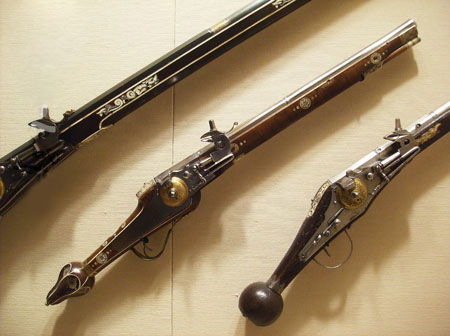 其实,在重武器普及之前,一种先进的枪支往往是改变战争结局甚至国家命运的关键。同人类所有奢侈品一样,对这些在诞生之初还极为复杂和昂贵的火器,匠人们毫不吝惜为它配以华贵的装饰。16世纪初开始代替火绳枪的革命性发明——转轮打火枪就不乏镶金嵌玉的奢华之作,至今深受藏家追捧,也被一些欧洲博物馆视若镇馆之宝。有趣的是,发明转轮打火枪的,正是德国纽伦堡著名钟表师约翰-基夫斯,这从侧面揭示了枪械与钟表用工精深的共同渊源。随后出现的燧发枪同样被欧洲贵族们搞得珠光宝气、做工华丽。