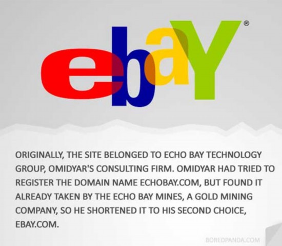 eBay最早是属于Echo Bay Technology Group所有,但创办人Omidyar网域名称时,发现Echobay.com已经被别的公司使用,所以才改成eBay.com。