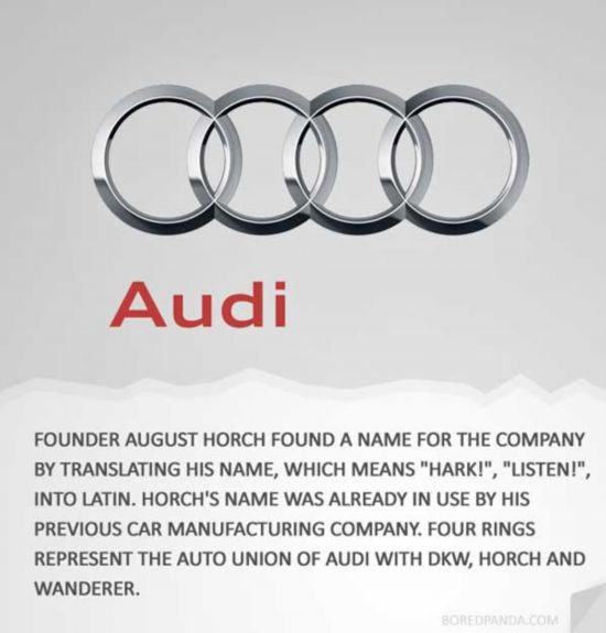 Audi创办人August Horch的名字在拉丁文中,就是“Audi”,也就是听觉的意思,之所以会坚持要翻成拉丁文,其实是因为“Horch”已经被他用在另一家汽车制造厂上头,为了避免重复,所以才翻成拉丁文,而Audi商标上的那四个圆环,代表的就是Audi和其他三间汽车厂商DKW、Horch和Wanderer所组成的汽车联盟。