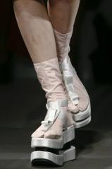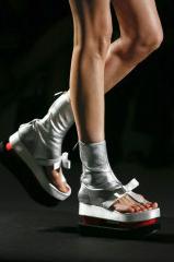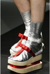 3. 2013年春夏的PRADA 以非常明显的日本传统服饰为主线 于是厚底木屐成为了这一季的亮点 方正挺括的蝴蝶结以及边缘鲜明的立体花朵装饰让鞋款显得俏丽而又设计感十足 缎面的大量使用也让这些单品萦绕着高贵的小气息
