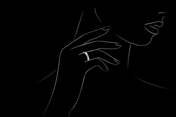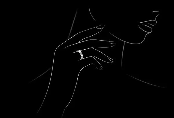 三环戒指:一个白18K金环,一个黑色精密陶瓷环和一个镶嵌钻石的白18K金环。