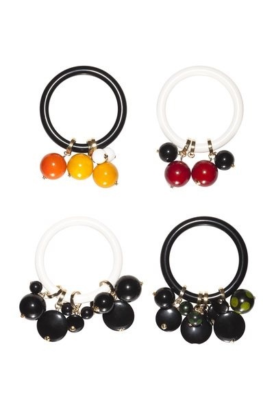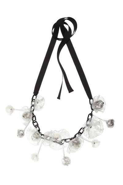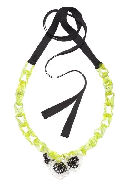 Marni 2012夏季系列首饰的一大特色。设计师利用回收塑料和聚乙烯树脂组合而成华丽花状饰物,穿孔树脂呈现桑加罗蕾丝般的效果。耳环上的吊坠由几何形状的树脂制成。以黑色为基底色,加以适当的荧光色点缀,让每件首饰都足够靓眼。