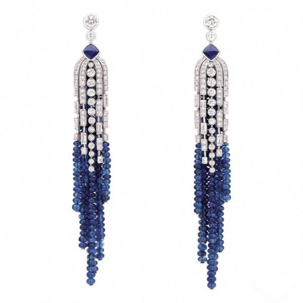 范冰冰佩戴的这款蓝宝石耳环,出自卡地亚Rialto系列。底下2颗梨形切割蓝宝石共重12.64克拉,上面2颗瓜形切割蓝宝石,被椭圆切割钻石衬托。而她佩戴的同系列高级珠宝戒指,52.24克拉蓝宝石采取祖母绿式切割,配钻石与铂金。蓝宝也是范爷最爱的宝石,彩色宝石搭配礼服,实在是红毯上不可多得的利器。