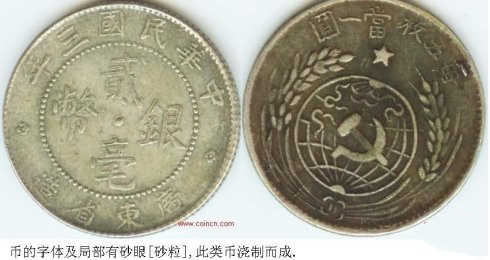 四、翻砂版银币:把这种银币用力向地上一砸,即刻碎裂,碎裂面呈浅灰色。该币表面粗糙,图像模糊不清,就主币来说,重量在20克以下,系翻砂版。目前市场上此种假币以“袁大头”为多,龙洋少见。