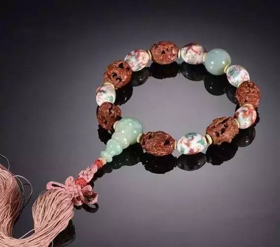 清代 橄榄核雕人物配红绿彩云龙纹瓷珠手串