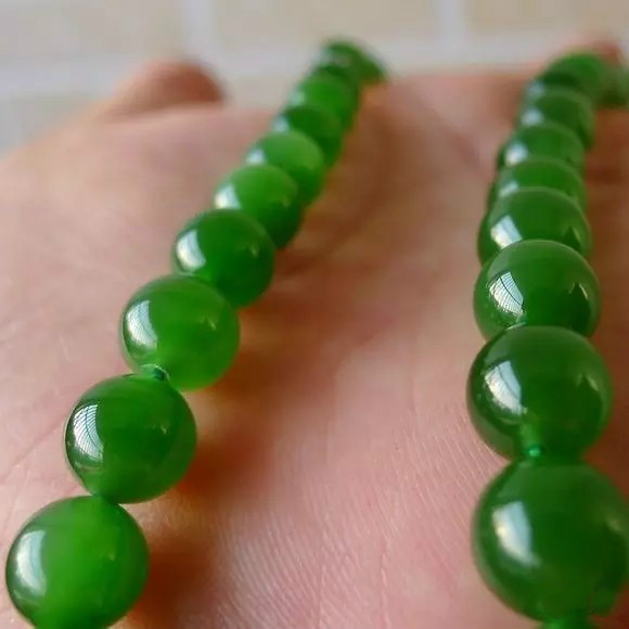 苹果绿颜色相对较浅,给人一种鲜嫩和阳光的感觉,所以很受青年玉友的喜爱。说到苹果绿让我想起乌兰海碧玉,它也是俄碧的一种,经常出一些淡绿的料子,这种料子密度很好。有不少优秀的苹果绿都是乌兰海出的,但上天给了它们好颜色的同时,黑点也稍微浓密一些。找不出黑点的苹果绿珠子甚至比菠菜绿还贵,这对追求纯度的玉友来说是件很遗憾的事。