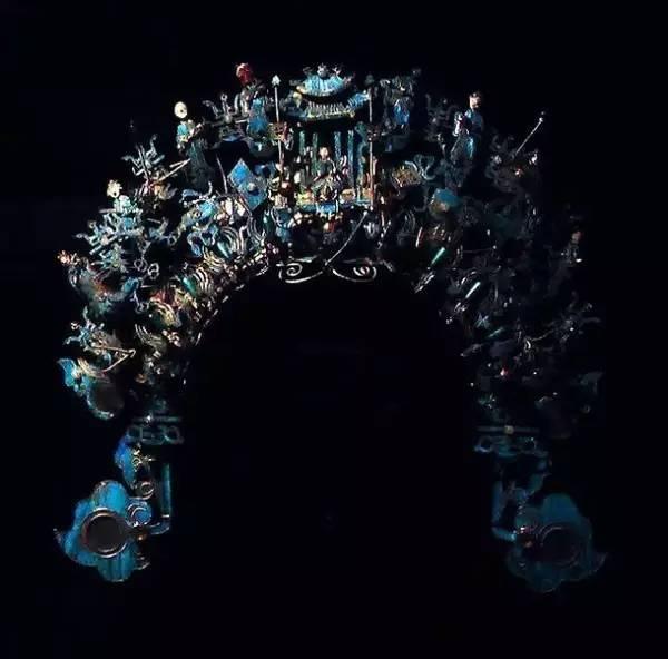 “这一头点翠头面,十几年前买的,80只翠鸟翅膀下的一点点羽毛,经过点翠师傅的加工,变成有流动光泽的头面,永不褪色。每次演出,后台总会有化妆师或同行爱好者,专注看它,赞不绝口。”
