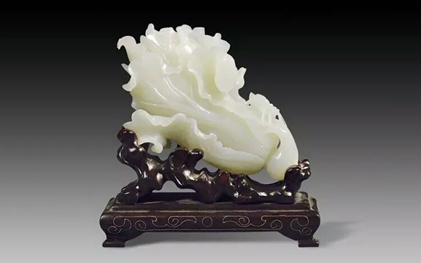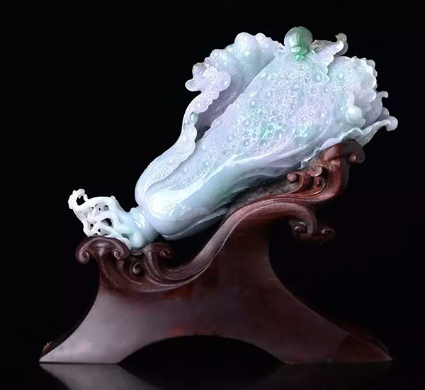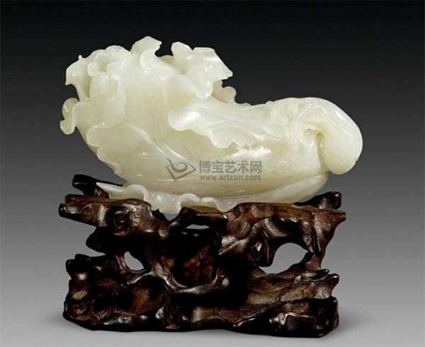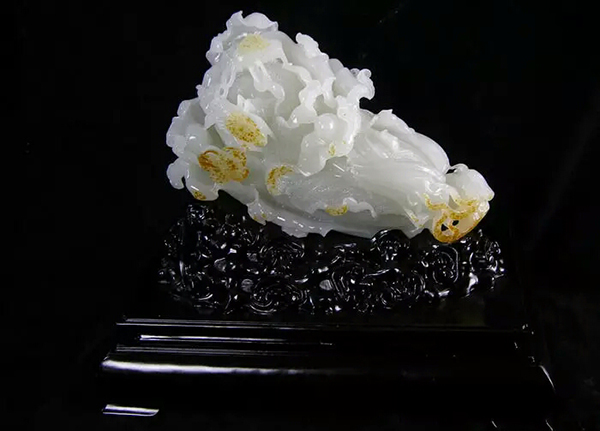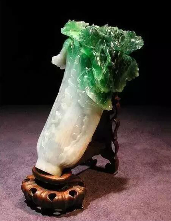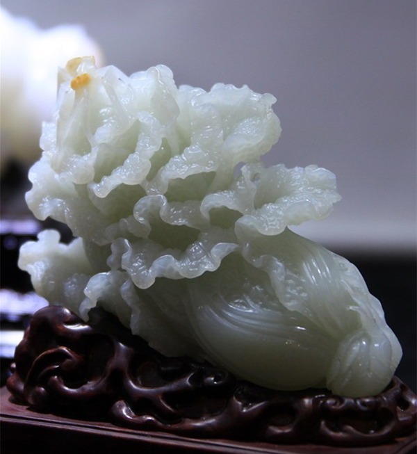 四、搭配。制作玉雕白菜摆件时要注意观察玉雕的托盘(基座),看其与玉件组合是否协调、得体。