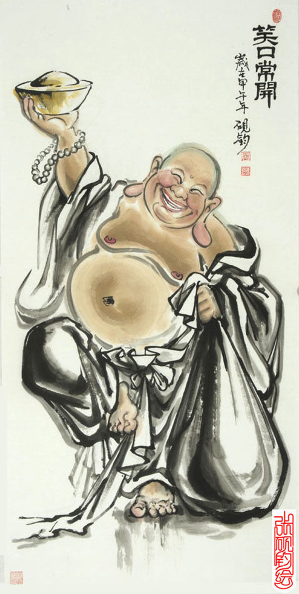 显露出一派宽厚、潇洒、超脱的胸怀。弥勒一旦化身大肚和尚以后,便迅速走入了千家万户,与人们的日常生活息相关了;他的形象成了人们警策世事、讽喻人生,同时宣扬佛法;劝戒行善的象征。南京多宝寺有一题大肚弥勒的对联: