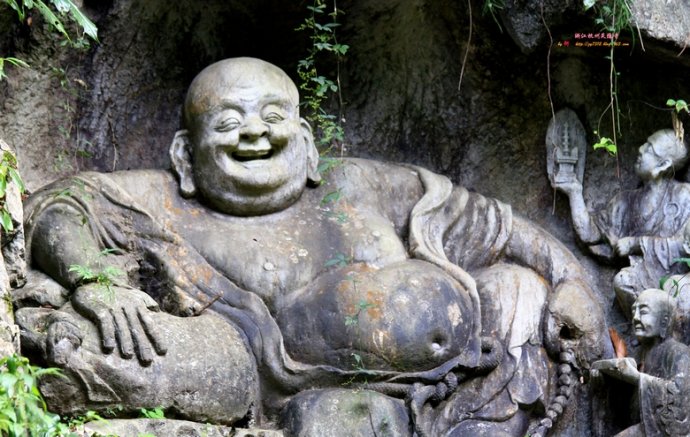 杭州飞来峰石窟的“笑佛”,是现存最早的大肚弥勒形象。造像为席地而坐的样式,亨手按着布袋,左手持丫串念珠,面呈憨厚笑容,双耳垂肩,下巴肥厚。本肚凸起,腹下束着一根绳,表情丰富、慈祥。在大肚弥勒两旁雕塑了十八罗汉像,环侍在弥勒身边。在北京潭拓寺的天王殿中,台座上也供着大肚圆滚,袒胸露腹,手掐佛珠,笑口常开的大肚弥勒。在弥勒像旁有一副著名的对联: