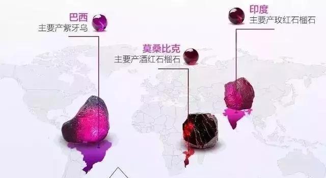 世界上石榴石的主要产地有巴西、斯里兰卡、印度、马达加斯加、美国、中国等国。