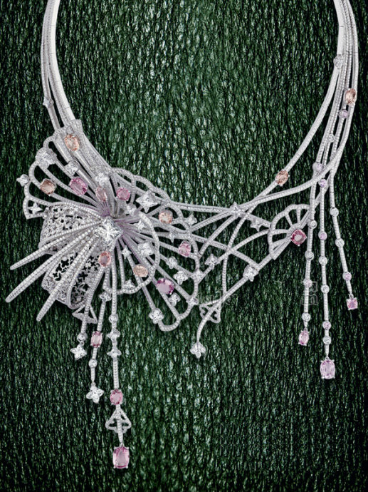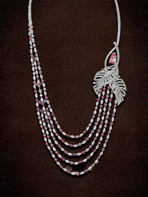 Plumes de Chanel系列羽毛造型项链甄选稀有珍贵的粉色偏橙色蓝宝石(Padparadscha),运用梨形切割、马眼形切割及明亮切割等精湛的技法,打造出一颗颗闪耀璀璨的珍宝,考究的镶嵌工艺将不同光泽度的宝石完美结合,呈现出浑然天成的绝代佳作。