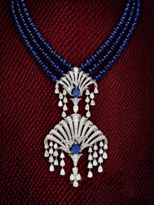 品牌花费数年时间收集项链上的蓝宝石珠串,能找到同样颜色与明亮度的蓝宝石珠串非常难得,经过精细的打磨工艺,使之更加圆润闪耀。精湛的镶嵌工艺将梨形切割钻石的流畅感发挥到了极致,令宝石服帖于肌肤之上,随着肢体呈现出多角度不同的光泽。