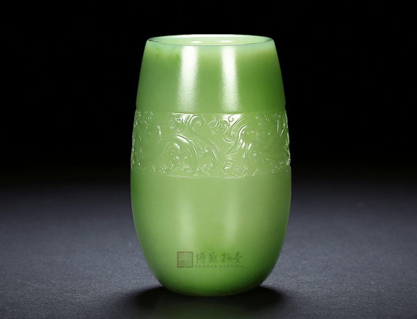 色青,柔和均匀,质地细苷,坚韧,滋润光洁,油脂—蜡状光泽,基本无绺、裂、杂质其他缺陷,半透明状,为青玉中佼佼者。