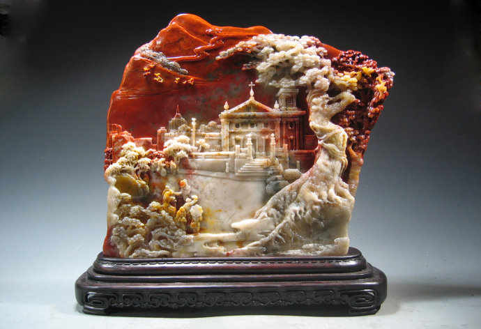 《妈祖阁》利用寿山石红、黄、白三种天然色彩,以精湛的半圆雕、高浮雕、薄意雕等技艺,刻划出秀丽的妈阁风光。艺术表现上,宏略大度,丰富多变,讲求整体神韵和意境美。作品主题突出,以艺术浓缩手法,把路环的妈祖雕像融入妈阁组群,强化了主题内涵;刻划精细凝炼,写实手法的深化,在这里得到充分展示:妈阁庙、牌坊、石亭……错落有致,生动形象,近景远景融为一体,起翘的庙脊、庙前的石狮,都体现出妈阁这一历史遗迹的特征;而动静、疏密、远近、今古建筑的刻划对比,更使古老与现代之间相映成辉,妈阁,宛若琼宫玉宇。