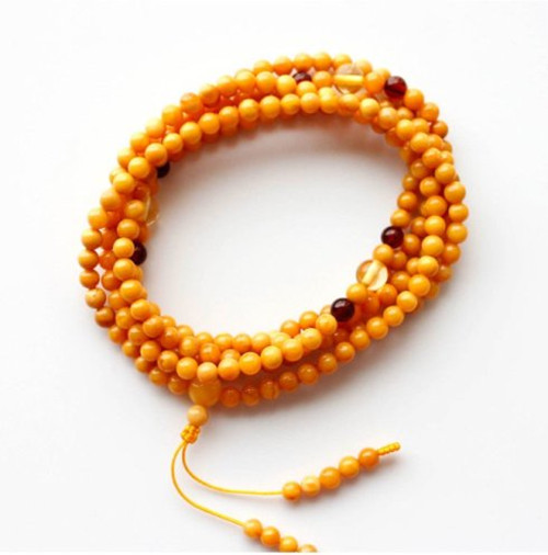 蜜蜡是琥珀的一种,因其色如蜜,光如蜡而得名,呈明黄至暗红色不透明体。在物理和化学成分上蜜蜡和琥珀没有区别,为了区分,有人简单地将透明的叫琥珀,不透明的就叫蜜蜡。其实蜜蜡是较为高级的琥珀,所谓“千年琥珀、万年蜜蜡”,可见其形成的年代要比琥珀更加久远。蜜蜡的质地柔美、色泽温润,深受人们的喜爱。