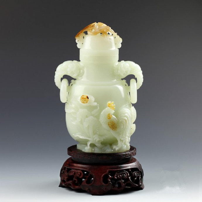 作品质地细腻,油润光莹。瓶体比例匀称,线条秀美流畅。风格典雅大方、轻巧俊秀。炉瓶象耳雕刻精美,瓶面雄鸡回首顾盼,神奇十足;鸡冠花随风摇曳,婀娜多姿。