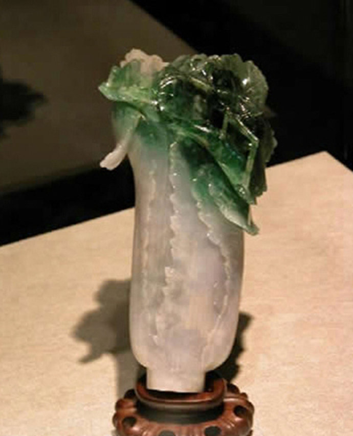 这株白菜据说是清代光绪皇帝瑾妃的陪嫁之物,白菜寓意清白,象征着新娘的纯洁,而白菜叶片上停留的两只虫则有多子多孙的涵义。