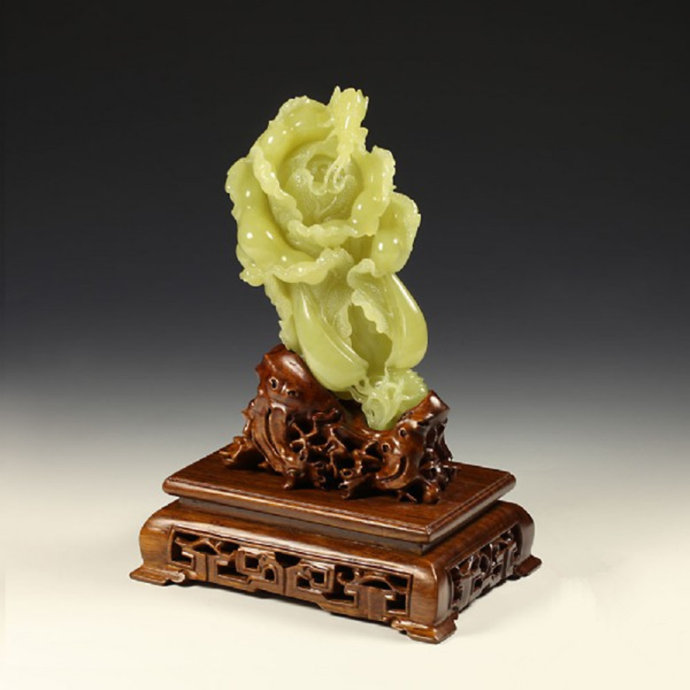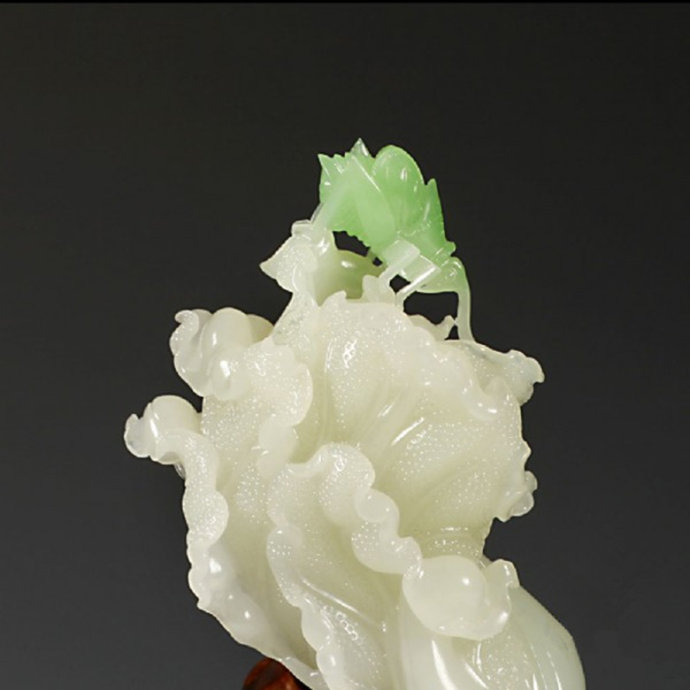 此件作品,以碧玉精雕而成,叶片翻卷如意,层次明晰,雕工精湛,加之通体青翠欲滴,较之上两件作品,别有一种夺目之美。