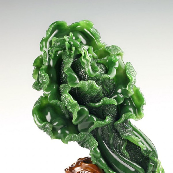 这株翡翠玉白菜以一块半白半绿的翡翠为原材料,因材施以巧雕工艺,将绿色部分雕成菜叶,白色部分雕成菜帮,形态喜人,鲜活欲滴。翠色部位巧雕了两只昆虫,一为蝗虫,一为螽(音终)斯即通常所谓的蝈蝈。