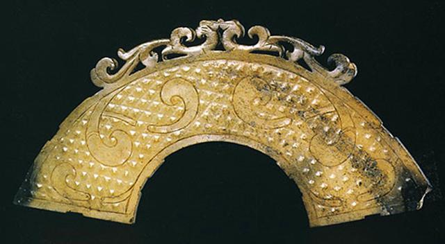 璜:璧的三分之一。形状有扇形、半环形、半月形、拱桥形。璜古代用来祭祀北方之神玄武,广泛用作佩饰。璜的纹饰似龙头,虎头为多,也有龙形、鱼形,表面刻成鳞纹、云纹、鸟纹、三角纹等。