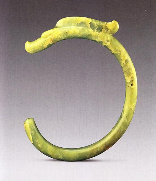 玉料青绿色,微透光。龙头部雕琢细致,眼大而凸起,嘴长而前凸。鼻上翘,长鬣后飘,边缘呈刃状,身为长圆柱状,弯成椭圆形。素身、秃尾。身体中部有一细孔。