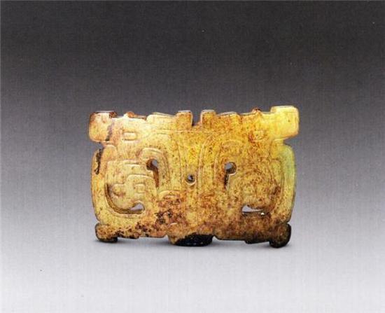 玉料青白色,局部有较重的褐色。片状、较薄,中部隆起,似瓦面,边缘随兽面图案有凸凹变化。此作品自中部可分为两部分,相互对称,各部分皆似卷曲之龙身。长方形眼,阴线多呈一面坡状,为西周玉器图案风格。