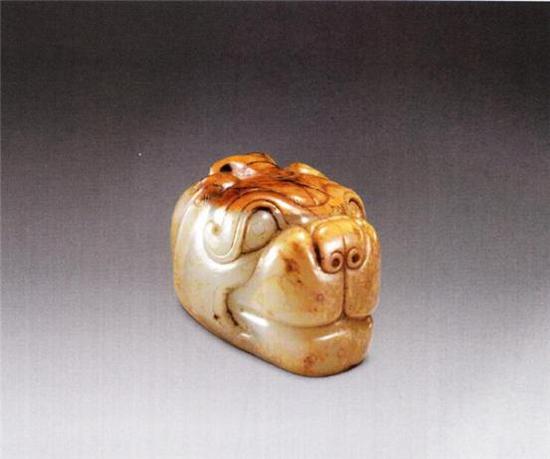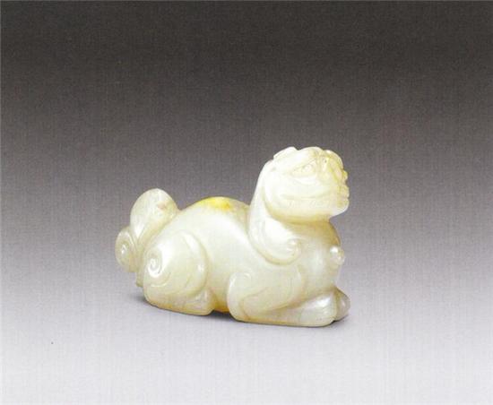 玉料暗白色,兽背部有黄斑。埤立体造型,头部雕琢复杂,阔嘴,意形鼻、重眉,眉、嘴、腮部有阴线细纹。粗颈,躬身,伏地状,肢前弯,尾呈分卷式,一歧上冲,其上有细阴线纹。