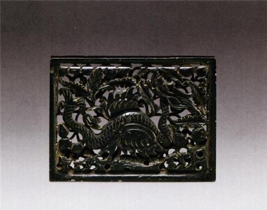 碧玉,深碧色。共二十块,镂空透雕。蟠龙形,龙昂首,张口,毛发后披,身细长似蟒蛇,有鳞,皆有飞翼,尾分两叉,底衬以翻卷的叶草纹。此套碧玉带板是由大长方形两块、中长方形八块、小长方形四块、桃形六块合并而成的。