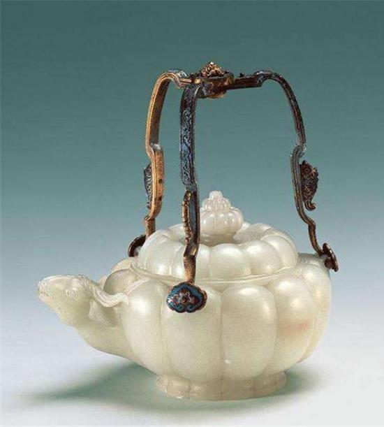 玉壶是清代宫廷重要的生活用品之一,样式极多,除羊首壶外,尚有凤首壶、龙首壶等,还有与玉杯、盘成套者。此壶以瓜棱形作器身,以羊首作流,结合了动物和植物的题材,又将玉器的素净与珐琅的斑斓集于一器,造型新颖别致,从质地到作工均属上乘,为清嘉庆时期不可多得的艺术珍品。
