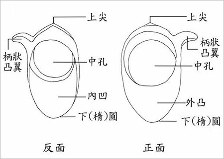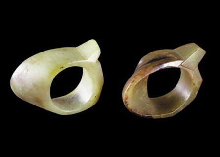 春秋战国时期,玉韘的基本形状为上端呈圆形,下端横截面呈鸡心形,其兽面纹、卷云纹作主要装饰,与商代玉韘颇为相似。其区别在于:春秋战国时期,玉韘 形制较矮,形状犹如指环,后端中部有一尖状凸起,一侧端还有一倾斜向上的柄状凸饰,但凸处饰有凤头形或兽面,不过已趋于抽象化。由此可看出,春秋战国时期 的韘形器和商代有很大不同。