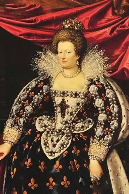 从穿衣打扮就可以看得出,绘制《法国王后玛丽亚·德·梅迪奇肖像》这幅画时,玛丽亚还在人生的巅峰时期。画中的她平静的目光中显露出冷峻,一身珍珠镶嵌的蓝色丝绒长裙掩饰不住十足的霸气。长裙的花纹采用立体浮雕绣法,缀上附有佛罗伦萨标志的金色百合,袖口和领口的蕾丝花边衬托出雍容华贵的身份和气质。玛丽亚酷爱珍珠,从耳环、项链、手镯的装饰就能看出,全部使用了她所珍爱的珍珠,连王冠和衣服都镶嵌上大而鲜明的珠子。光是玛丽亚这身衣服就动用了300余颗超大号的珍珠。此外,衣服上的十字架和勾连珍珠的器物都是由顶面磨平的钻石装点而成,手上那颗大钻戒也在低调地闪烁着光芒。而这仅仅是她精美珠宝中的一部分,玛丽亚的奢华生活可见一斑。