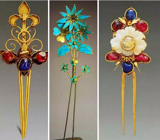 清代金镶宝石发钗(左)清代点翠发钗(中)清代金镶宝石及白玉发钗(右)