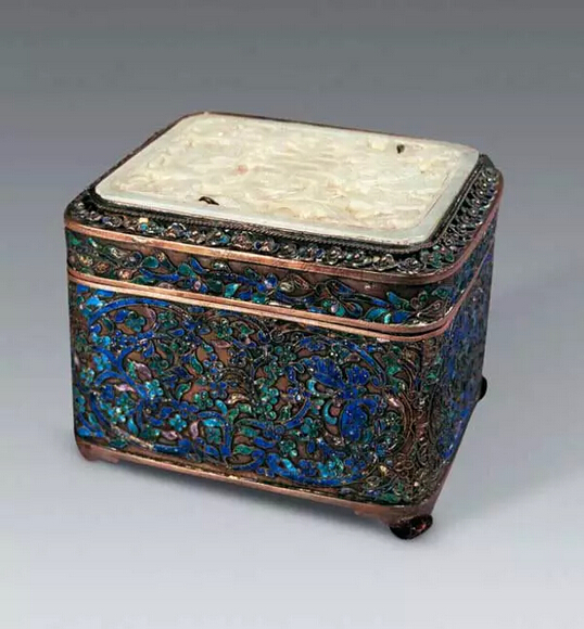 清代,烧蓝嵌玉银首饰盒