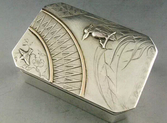 这款八角银色首饰盒上依然采用了浮雕的技艺,借鉴了日本及东方传统绘画的风格,翠鸟、梅花、兰花等自然景物跃然于盒盖之上,充满着中西结合之美。