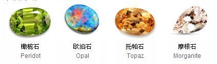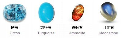 半宝石(SemiPrecious Stones )欧泊、托帕斯石(古称酒黄宝石)、坦桑石尖晶石、水晶、电气石(碧玺)、锆石、拉长石(月光石)、海蓝宝石、橄榄石、玛瑙、珊瑚、石榴石。珍珠黑曜石绿松石