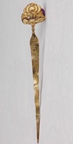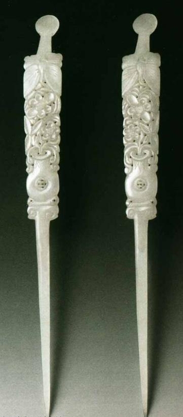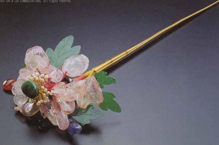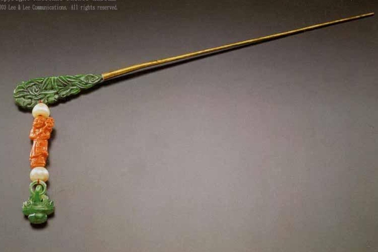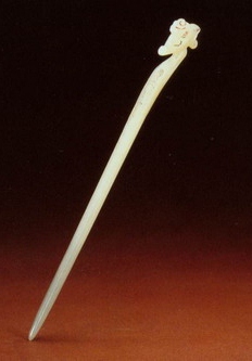 笄(jī) 古时男女都结发,为使发髻不致松散,故需用发簪贯连、固定,它在西周春秋时就有了。早时的笄据说有“鬠笄”和“冠笄”两种。鬠笄是男女共用以安髻的,冠笄是男子用来固定冠冕的。